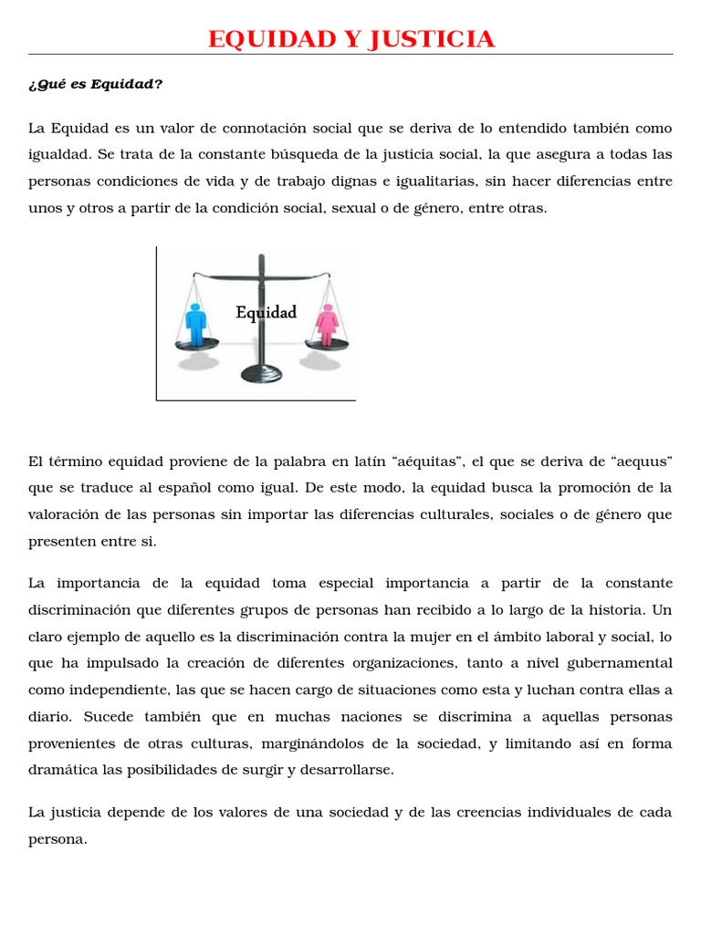 Mientras que la equidad es lo mismo pero añadiéndole una visión más personal. Igualdad y equidad son términos muy cercanos. Equidad significa dar o recibir según sea necesario, mientras que igualdad significa dar o recibir como el otro individuo recibe. La equidad por otro lado tiene como fin último que exista la justicia dentro de la igualdad, por así decirlo. Para conseguir la igualdad es necesario, en la mayoría de los casos, entrar en la desigualdad. Aquí es donde aparece el concepto de equidad que es aquel intenta promover la igualdad, más allá de las diferencias. La equidad introduce un principio ético o de justicia en la igualdad. Por lo que también se han propuesto variadas definiciones de igualdad entrelazadas con la equidad; Haciéndose que la equidad se evidencie en. Las ideas incluyen conocer a cada niño, celebrar su potencial, reconocer sus desafíos, reconocer la inequidad y usar la cultura como un recurso. Te gustó, te sirvió, quieres mas cápsulas de información??dejanos tu comentario hola, bienvenidos a la cápsula sea comparte. La equidad nos obliga a plantearnos los objetivos que debemos conseguir para avanzar. Igualdad y equidad en el sd.